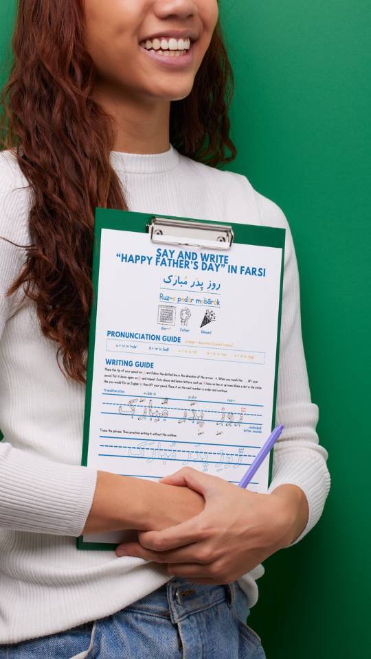 - 1 full page worksheet to help you practice saying and writing “Happy Father’s Day” in Farsi (Persian), including a pronunciation guide, transliteration, and vowel diacritics, plus a tracing guide.